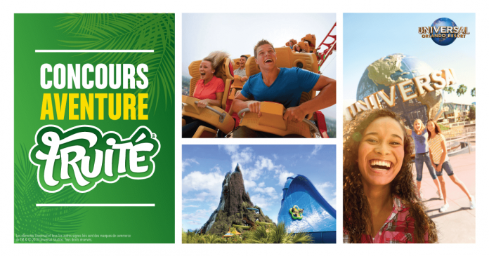 Il est temps d’inscrire ton code promo pour participer au Concours Aventure Fruité et ainsi courir la chance de gagner l’un des 3 voyages pour 4 personnes à Universal Orlando Resort d’une valeur de 6 383,40$ chacun.