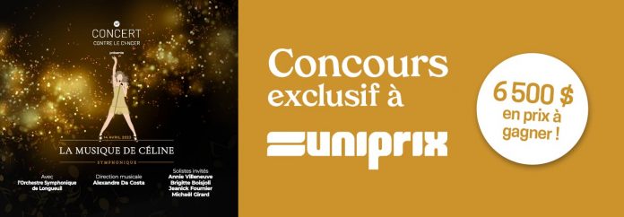 Le Concours Uniprix La Musique de Céline Concert Contre Le Cancer 2023 à uniprix.com est votre chance de gagner une paire de billets VIP pour assister au Concert contre le cancer – La musique de Céline de l’Institut du cancer de Montréal.